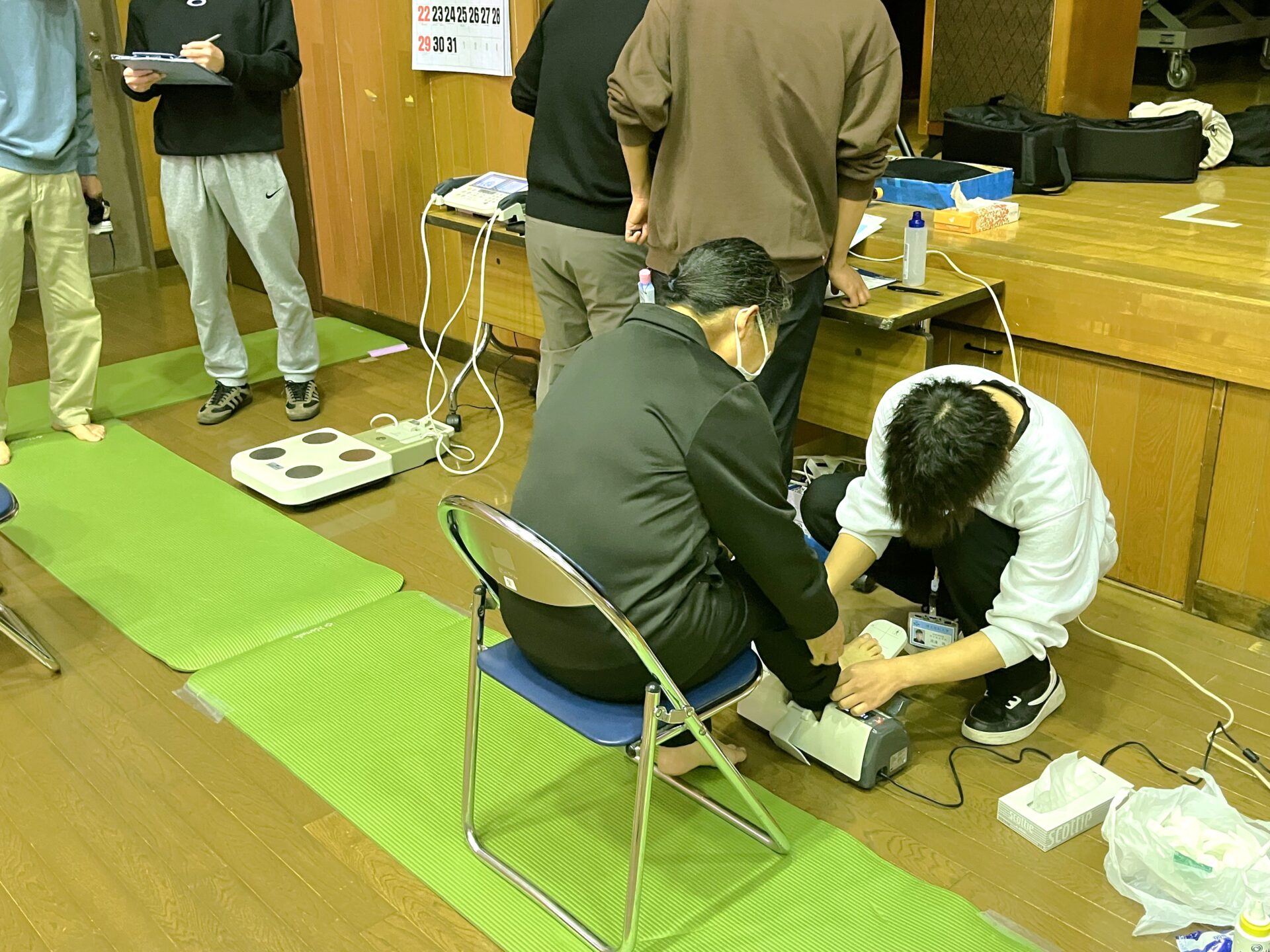 測定の前には体力測定の目的や測定方法について説明が行われました。その後、各測定ブースに分かれて測定が実施されました。