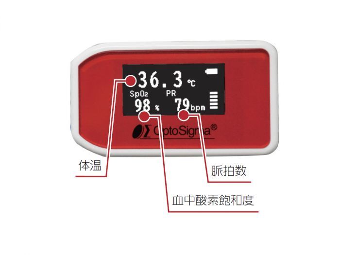 本製品は、取扱説明書に記載された手順および注意事項に従ってご使用ください。SpO₂の測定値は、末梢循環の状態や装着状況、体動などの影響により表示が変動する場合があります。また、体温測定は測定部位や環境温の影響を受けるため、所定の測定手順に基づいて実施してください。