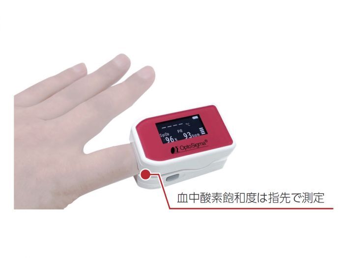 SpO₂は血中酸素飽和度を示す指標で、血液中の酸素の状態を推定する値です。 パルスオキシメーターにより非侵襲で測定することができます。