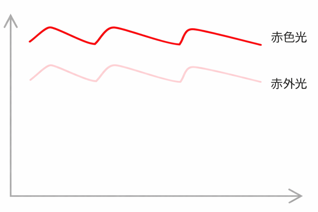 赤色光と赤外光の吸光度の差から、血中酸素飽和度(SpO₂)を算出します。
